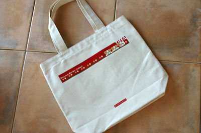 ナチュラルカラーのバッグにドットレッドのデザイン。