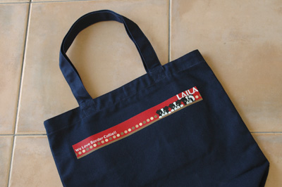 ネイビーカラーのバッグにドットレッドのデザイン。